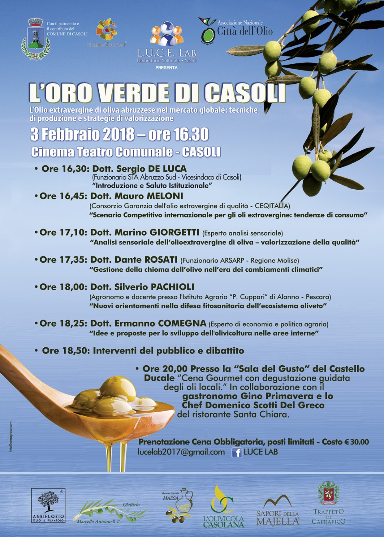 L'Oro verde di Casoli è il convegno sull’olio extravergine di oliva che vedrà la partecipazione di esperti del settore a livello nazionale. L’appuntamento organizzato dall'associazione L.U.C.E. Lab si terrà il 3 Febbraio presso il Teatro Comunale