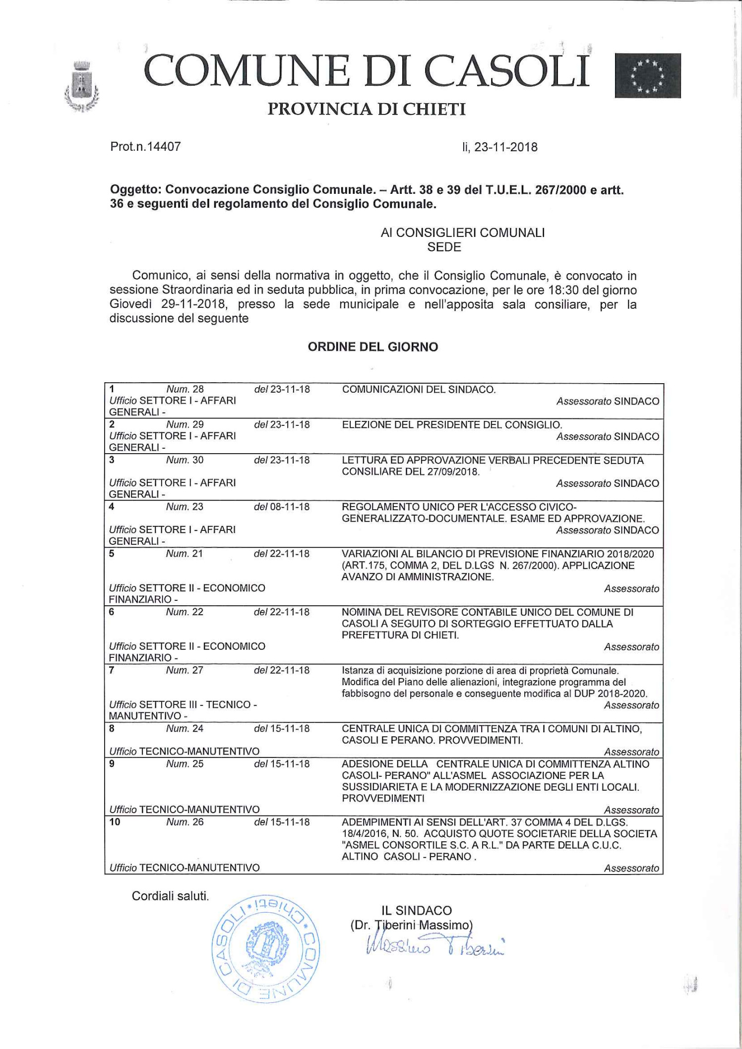 Convocazione Consiglio Comunale del 29 Novembre 2018 ore 18:30