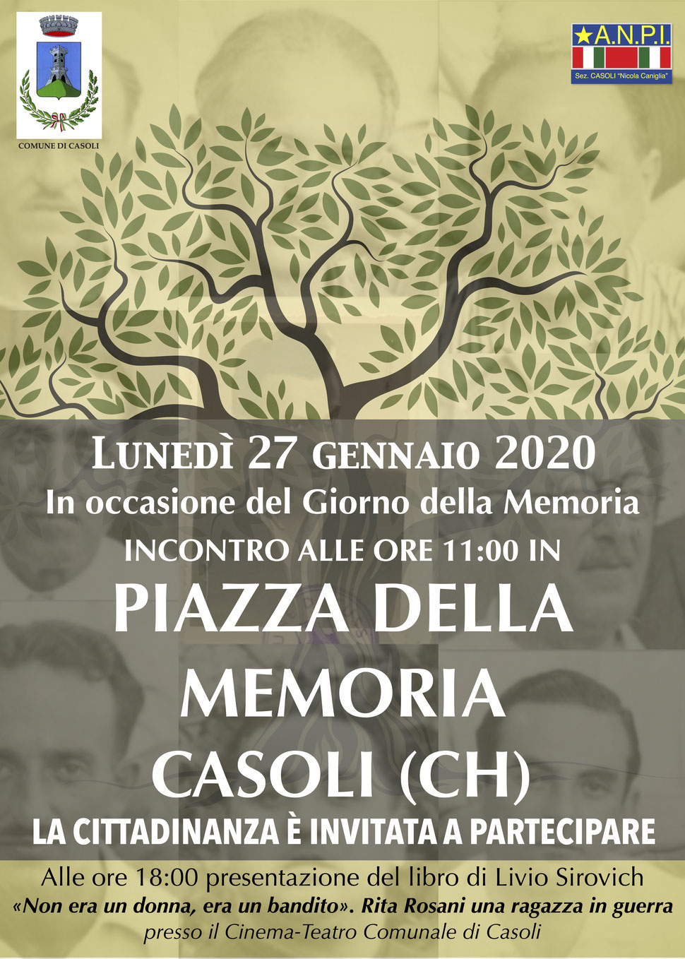 Il 26 Gennaio 2020 alle ore 16 presso il Teatro Comunale, inaugurazione della mostra storico-documentaria "I campi di concentramento fascisti in Abruzzo dal 1940 al 1943" e a seguire, alle ore 18, la conferenza "La paura dell'altro - dalle leggi razziste alle deportazioni" Il 27 Gennio 2020 saranno presentati due volumi. Il primo in mattinata, all'Ist. A. Marino e il secondo, "Non era una donna, era un bandito" di Livio Sirovich, in pomeriggio alle ore 18 presso al Teatro Comunale. Tra i due eventi, alle ore 11.00, in Piazza della Memoria, l’amministrazione comunale pianterà un ulivo in memoria degli internati del campo di concentramento di Casoli. A Palazzo Tilli sempre in mattinata, ci sarà la seconda edizione de "Il Cammino della Memoria" con la partecipazione di 200 studenti delle scuole di Casoli e di altri Istituti.